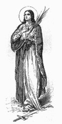 Under the emperor Alexander Severus she was discovered in a church one day by three officers of a search party, and commanded to follow them to a temple of Apollo. She cheerfully agreed, saying she would do so after praying for a short time and taking leave of her bishop. The officers reported their important capture to the emperor, believing she would readily renounce her faith. But when he ordered her to speak, she replied that she would sacrifice to none other than the true God, and never to idols, the handiwork of men. She was tortured by iron hooks, but her executioners were thrown to the ground amid a great light as she prayed, and arose converted, like Saint Paul, to the Christian faith.